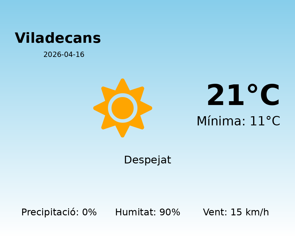 Els residents de Viladecans poden esperar un dia bastant estable pel que fa al clima avui, 16 d’abril de 2026. Segons les dades meteorològiques més recents, la jornada es presenta amb una temperatura màxima prevista de 21 graus i una mínima de 11 graus.