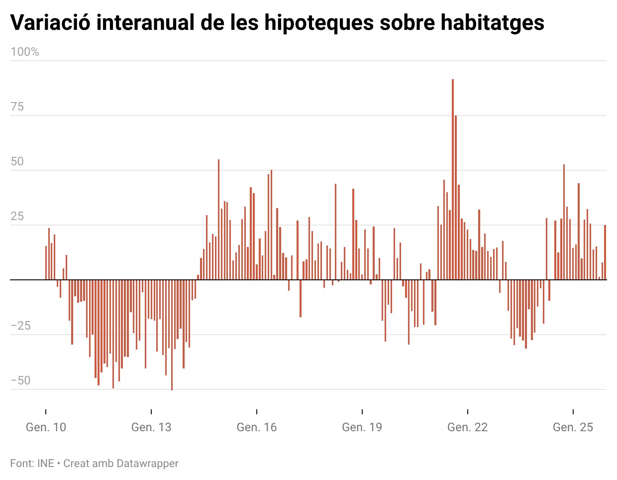 ACN Barcelona – Catalunya tanca el 2025 amb 87.011 hipoteques sobre habitatge inscrites, la dada més alta en un any des del 2010, quan n’hi van haver 94.752, segons les xifres que ha actualitzat l’Institut Nacional d’Estadística (INE) aquest dijous. En total, les firmes de préstecs per adquirir un pis o una casa han crescut un 18,41% en comparació amb l’exercici anterior, l’increment més alt en la dada acumulada de l’any des del 2021. Es tracta del segon exercici consecutiu en el qual augmenta el total d’hipoteques sobre habitatge després que el 2024 es registrés un increment de l’11,69%. Els préstecs han evolucionat a l’alça durant tot l’any i han tancat amb xifres que s’acosten als 195.000 euros per hipoteca, 23.000 més que el mateix mes de l’any passat.