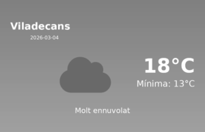 Predicció meteorològica per a Viladecans: 4 de març de 2026 Avui a Viladecans, esperem temperatures agradables, amb una màxima de 18 °C i una mínima...