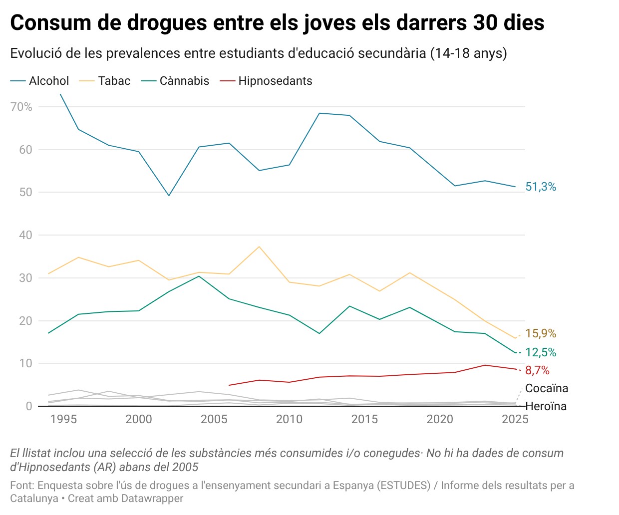 Pel que fa als hipnosedants, s’observa una lleugera disminució del consum després d’haver assolit els valors màxims l’any 2023. Tot i això, el 2025 un 6,4% de les noies i un 3,2% dels nois en consumien diàriament. Quan s’analitza el consum d’hipnosedants sense recepta mèdica, les prevalences són del 2,9% en les noies i de l’1% en els nois.