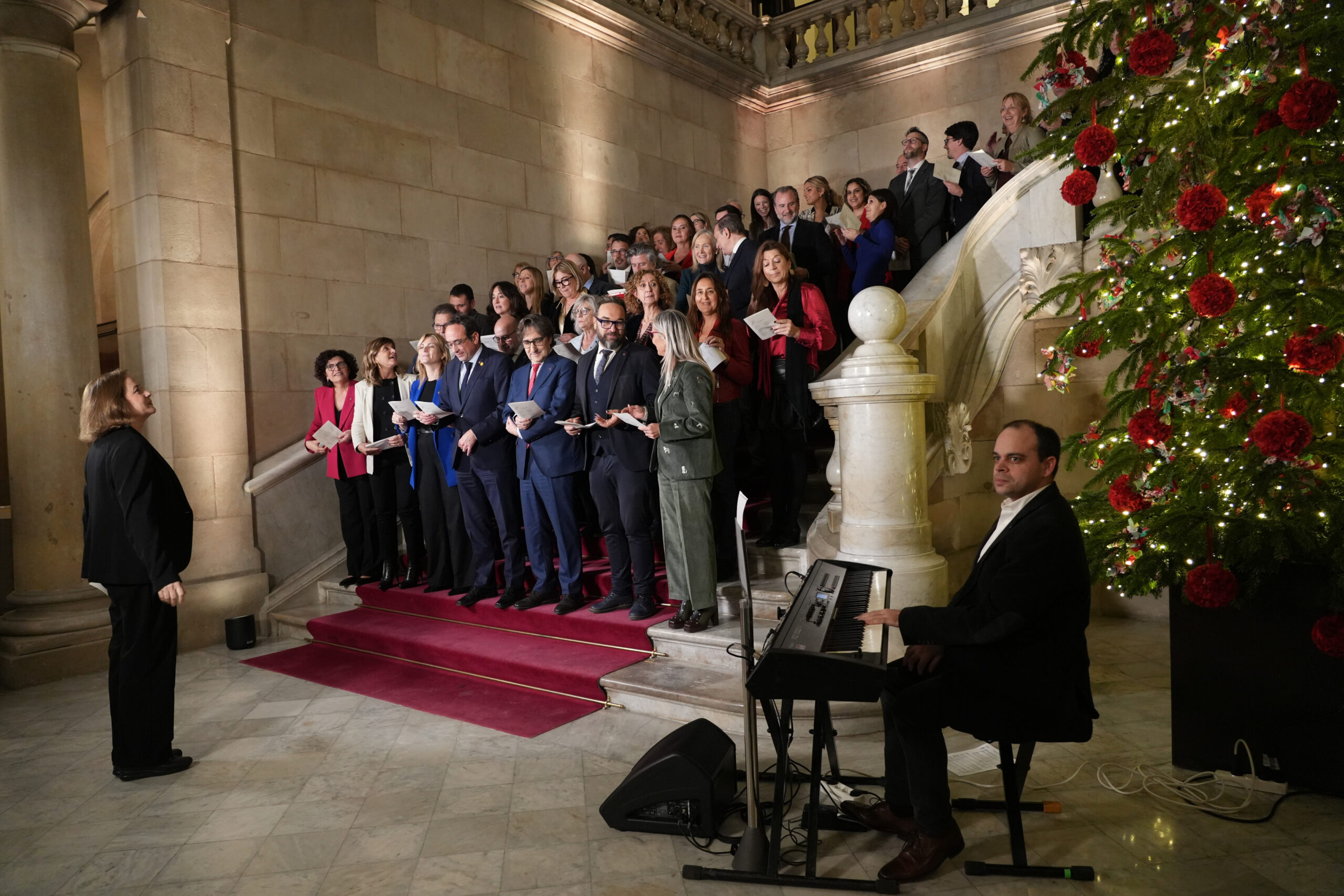 ACN Barcelona – “El 25 de desembre, fum, fum, fum”. Amb aquest vers ha començat la cantada de nadales al Parlament, en la segona edició consecutiva. ‘El trineu’, ‘Les dotze van tocant’ i ‘Quan somrius’ han protagonitzat la cantada d’aquest 2025 des de l’escala honorífica del Parlament, on hi han assistit una seixantena de diputats i diputades. El president de la cambra, Josep Rull, ha encapçalat la cantada, on també hi havia la consellera Esther Niubó. Finalment s’hi ha excusat el president del Govern, Salvador Illa. La coral parlamentària l’ha dirigit de nou la diputada del PSC Imma Ferret, i enguany s’hi ha incorporat un teclista -treballador de la cambra-. Hi havia representants de tots els grups menys de la CUP i Aliança -com l’any passat-.