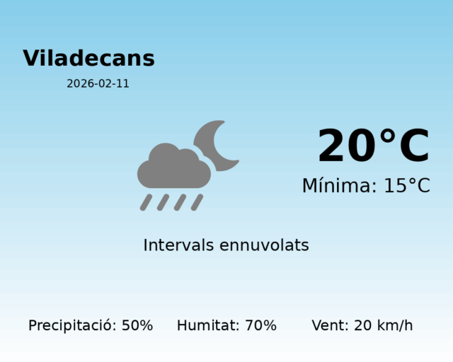Avui, 11 de febrer de 2026, el temps a Viladecans presentarà característiques variables que requereixen atenció especial. Aquesta jornada es preveu amb cels ennuvolats i possibilitat de precipitacions significatives.