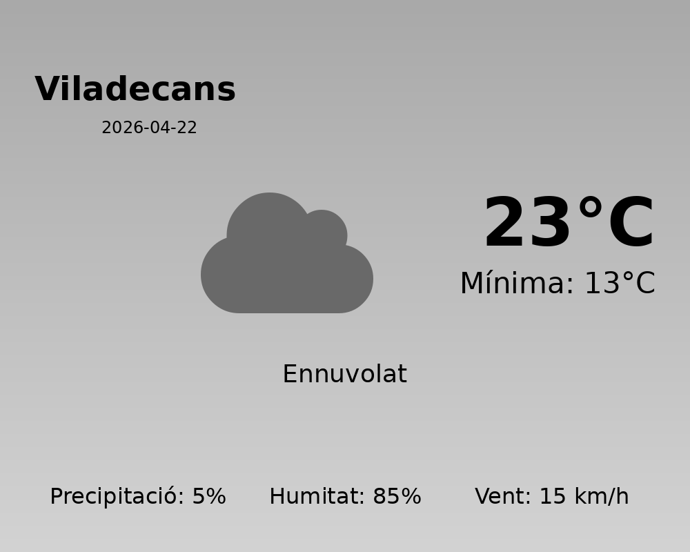 Avui a Viladecans s’espera un dia amb temperatures suaus i intervals de núvols. La temperatura màxima arribarà als 23 graus, mentre que la mínima serà de 13 graus, proporcionant un ambient agradable i primaveral.