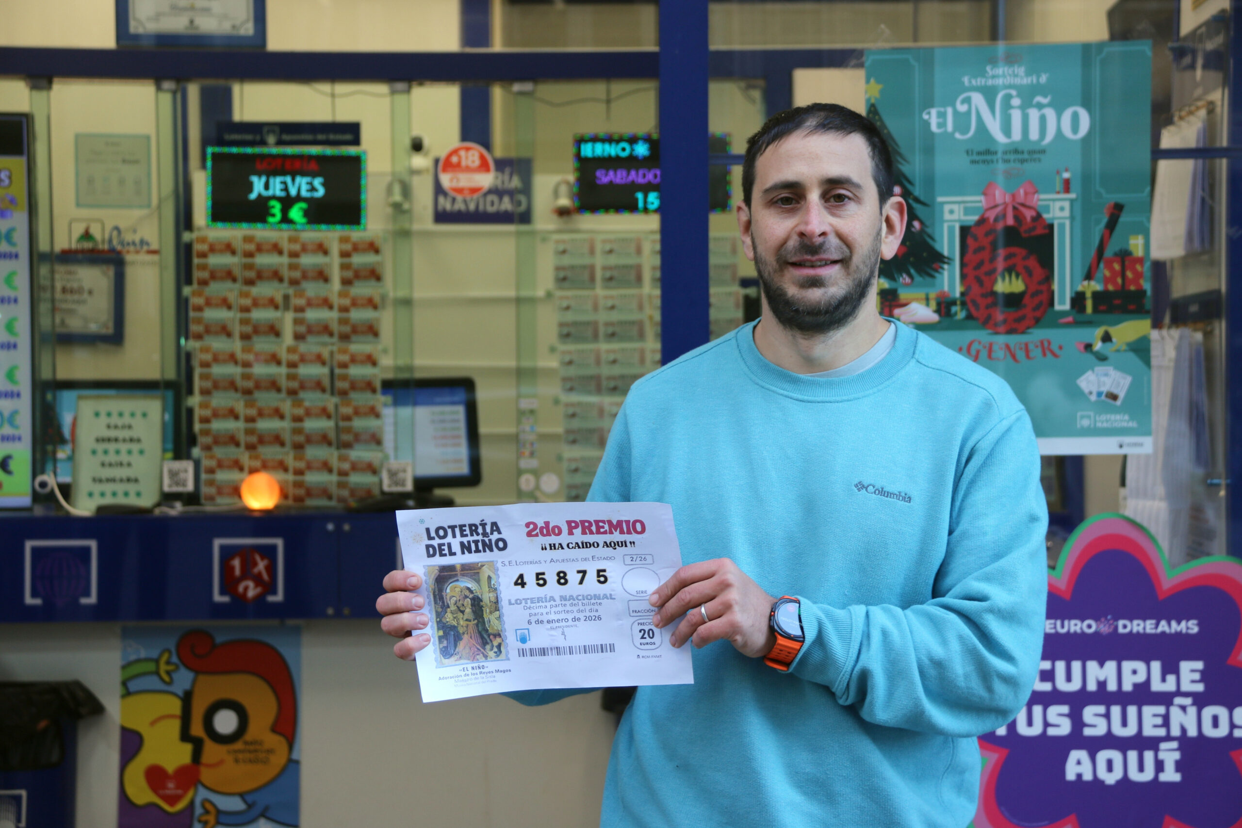 ACN Barcelona – Felicitat l’administració del carrer Sicília número 160 de Barcelona després de repartir un segon premi de la rifa de Reis, el número 45.875. El propietari de l’establiment, Pablo Martín, ha detallat que han venut 5 sèries de 50 dècims cadascuna, de manera que han repartit gairebé quatre milions d’euros. “Tant de bo siguin tots veïns del barri que ho necessitin”, ha afirmat en declaracions a l’ACN. Martín ha explicat que és la primera vegada que reparteixen un premi durant les loteries de Nadal i ha confiat que sigui “el primer de molts”. Durant aquest dimarts alguns veïns s’ha acostat a l’establiment del barri del Fort Pienc a celebrar el premi. “Estem molt feliços”, ha insistit Martín, que estava a l’administració amb la seva dona.