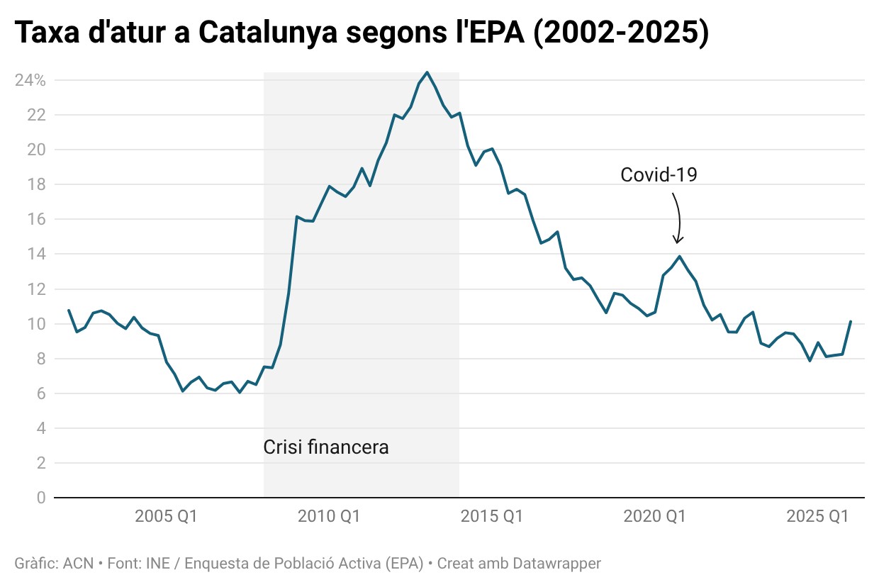 ACN Barcelona – La taxa d’atur ha crescut fins al 10,12% a Catalunya en el primer trimestre de l’any, 1,2 punts més que el mateix període de l’any passat i s’ha tornat a situar en el doble dígit després d’onze trimestre, segons les dades de l’Enquesta de Població Activa (EPA) que ha publicat aquest dimarts l’Institut Nacional d’Estadística (INE). En total, Catalunya ha començat l’any amb 435.600 aturats, un 24% més que el trimestre anterior i un 15,7% més que l’any passat. D’altra banda, l’ocupació s’ha reduït un 1,18% en comparació amb el període entre octubre i desembre, més del doble que l’any anterior (-0,16%) amb 46.200 feines menys.