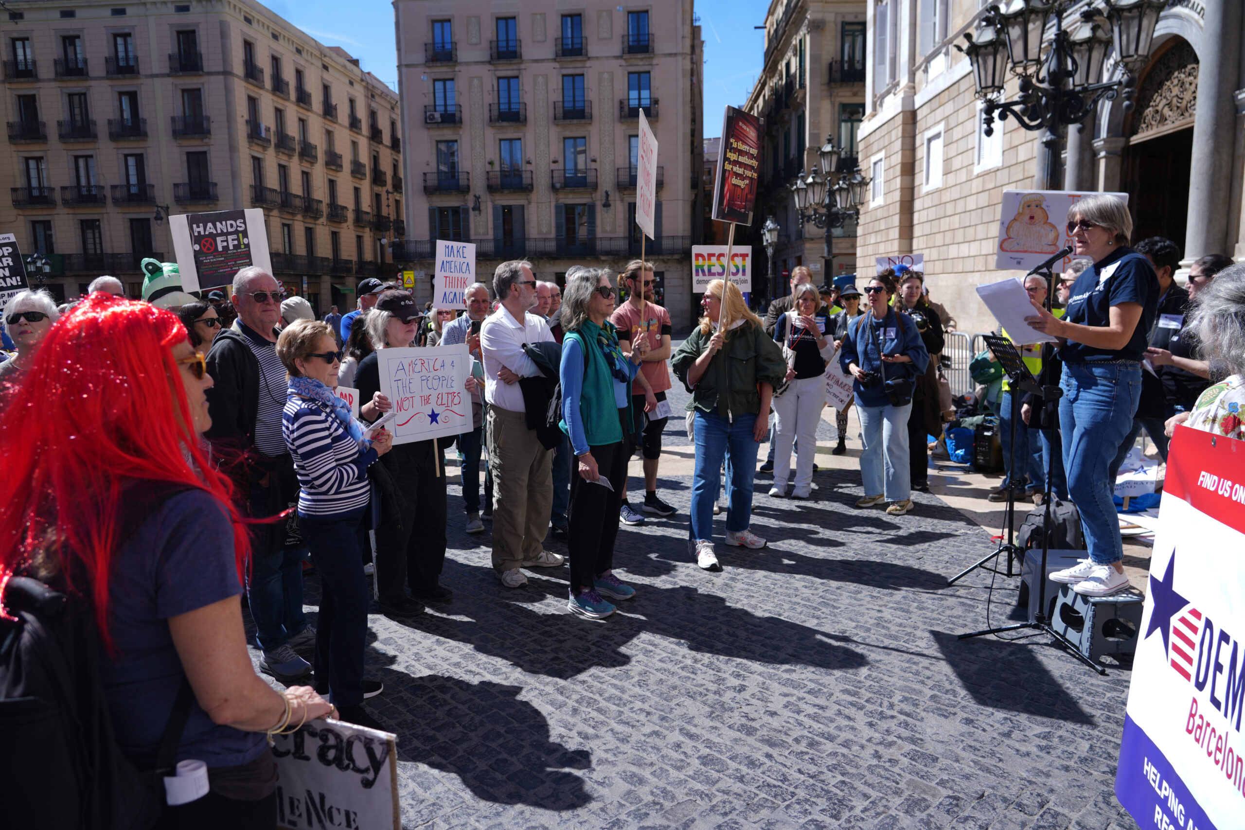 ACN Barcelona – Més de 200 persones s’han concentrat aquest dissabte a la plaça Sant Jaume de Barcelona per mostrar oposició a les accions “cada com més autoritàries” i “temeràries” del president dels EUA, Donald Trump. Convocats per Democrats Abroad (DA), el braç oficial del Partit Demòcrata representant els ciutadans nord-americans que viuen fora dels EUA, la concentració s’ha repetit en més de 3.000 punts arreu del planeta sota el lema ‘No Kings Day’ (Dia no als reis). En el cas de la concentració a Barcelona el lema escollit ha estat ‘No tirans!’. Residents nord-americans a la capital catalana s’han reunit per denunciar que les polítiques de Trump estan “fora de la llei i de la Constitució” i per defensar la democràcia i els drets humans.