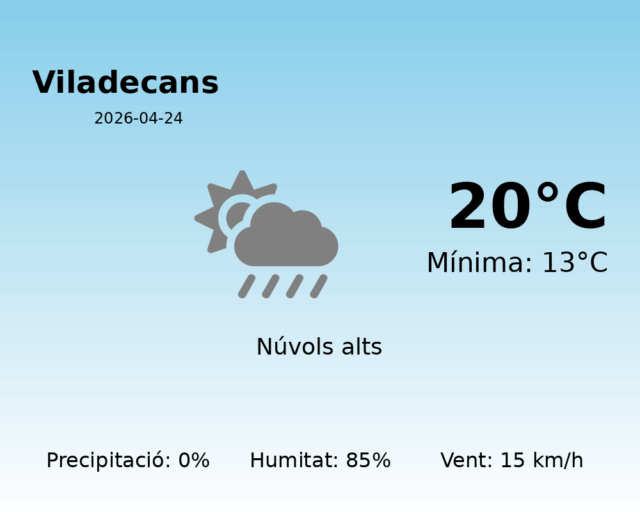 En resum, avui és un dia ideal per gaudir d’activitats a l’exterior a Viladecans. Recordeu portar una jaqueta lleugera per si el vent es torna lleugerament més fresc en algunes zones.
