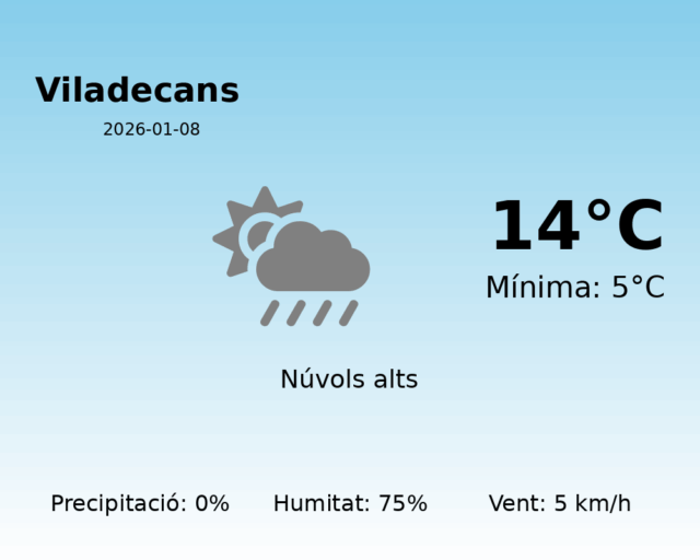 Avui, 8 de gener de 2026, Viladecans gaudirà d’un dia tranquil i majoritàriament estable pel que fa al temps. Amb unes temperatures que oscil·laran entre una màxima de 14°C i una mínima de 5°C, ens trobem davant d’una situació típica d’hivern suau en aquesta regió.