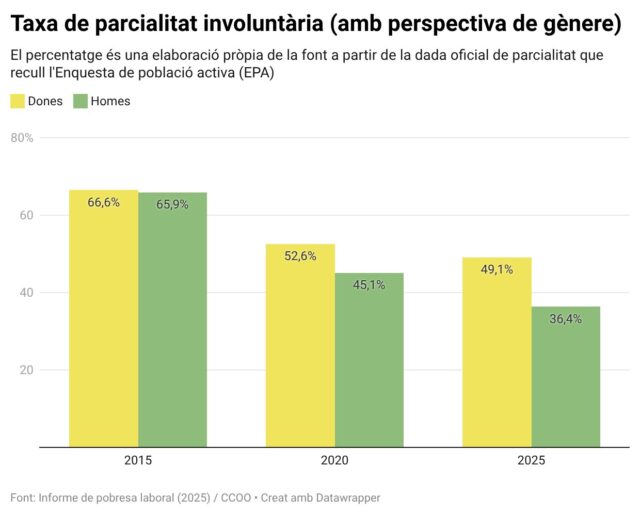 ACN Barcelona – Un informe de Comissions Obreres revela que prop de la meitat de les dones que treballen a jornada parcial ho fan de forma involuntària. Segons l’estudi presentat aquest dimecres, sobre pobresa laboral, la xifra se situa en el 49,1% en les dones, i baixa fins al 36,4% en els homes. Segons la secretària general de CCOO, Belén López, aquest “és un dels principals motius” per entendre la bretxa salarial i la precarietat de les dones en l’àmbit laboral. A més, el sindicat creu que la parcialitat no volguda és una de les causes de l’increment de la pluriocupació d’un 53,7% en una dècada. L’informe també afirma que el perfil més habitual de pobresa laboral és el de la dona, de mitjana edat, estrangera i ocupada en agricultura o hostaleria.