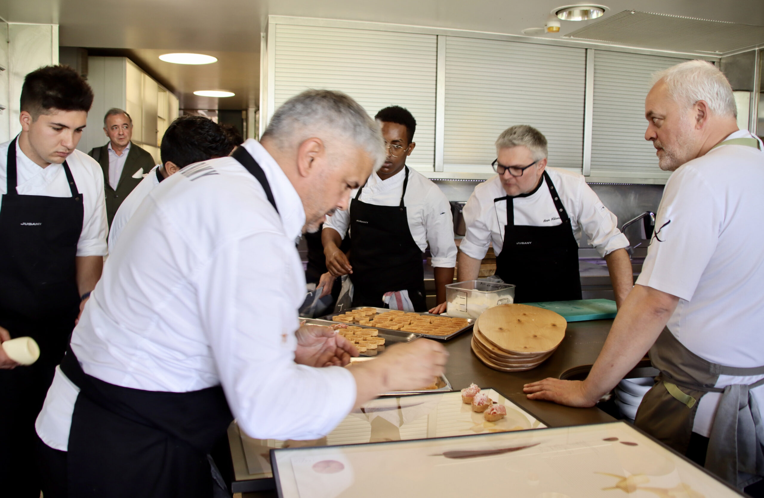 El menú ha començat amb uns aperitius de benvinguda a càrrec de Nandu Jubany, i ha continuat amb el ravioli de gamba a l’oli de ceps (Paolo Casagrande, Lasarte); naps i moll de l’os amb llenties i caviar (Albert Adrià, Enigma Barcelona); tripa de bacallà amb botifarra negra i salsitxes (Xavier Pellicer); milfulls de papada amb tòfona (Javier Torres, Hermanos Torres), i jarret de vedella (Óscar Velasco, Velasco Abellà). Les postres han inclòs el timbal de maduixots (Joan Roca, El Celler de Can Roca) i els bunyols de xocolata amb roca de coco (Oriol Castro, Disfrutar).